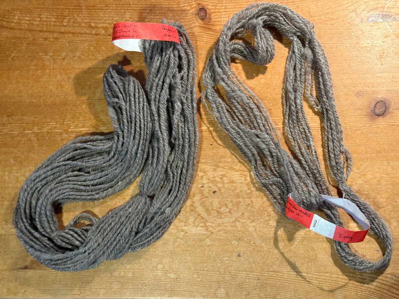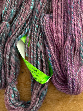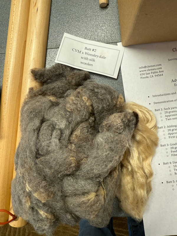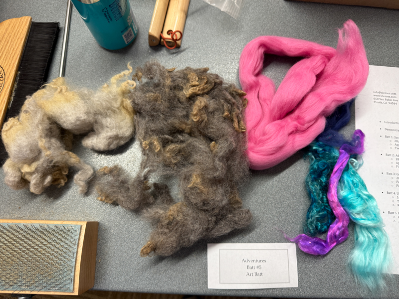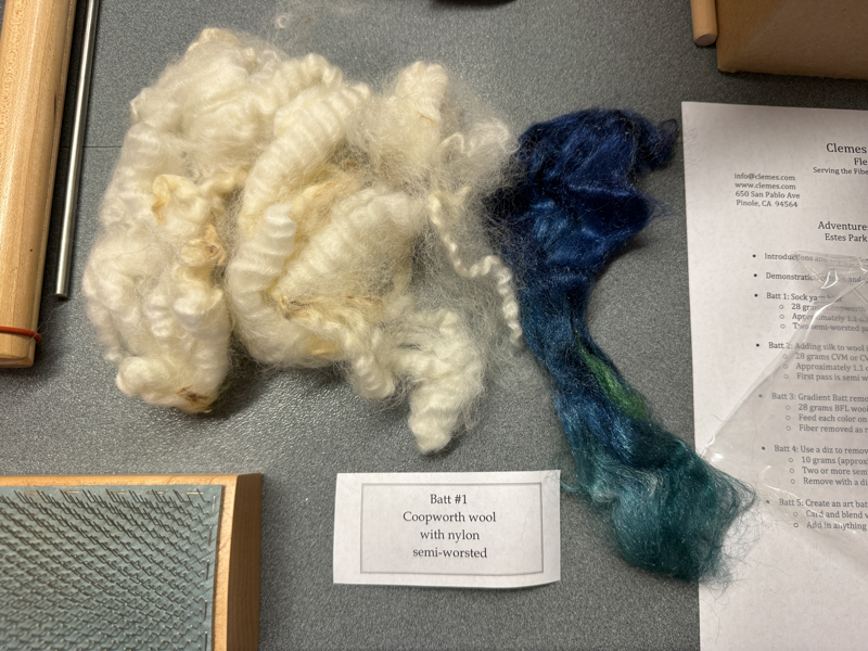 In June 2025, I had the pleasure of taking the Clemes & Clemes “Adventures in Carding” workshop at the Estes Park Woolfest. I loved it — a very well setup class, with exercises that led us through a variety of techniques and results. Different blends (colour and fibre makeup), different spinning preps. I got most of the carding done on the day as planned, finishing up the last project (art batts) when I got home. And then I spun up the batts into yarns.