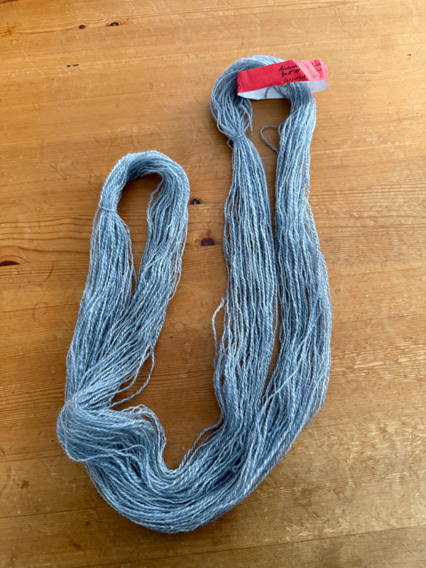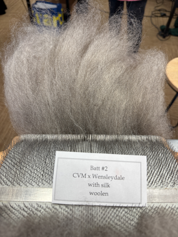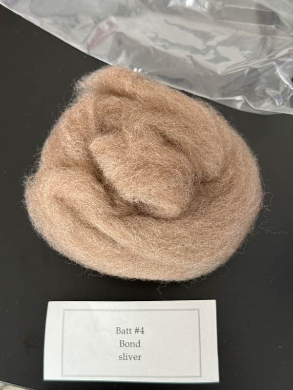 We had some bond fiber, which we carded and then dizzed off the carder. That produced a very organized sliver, perfect for worsted spinning (SFD). The sliver was nice, but it was only once I had the spun yarn in my hands that I really appreciated just how delightful the Bond fibre was — so soft, so springy, even with such a fine spin! (Why, yes, I did promptly order some more Bond fibre, why do you ask? :^) ).