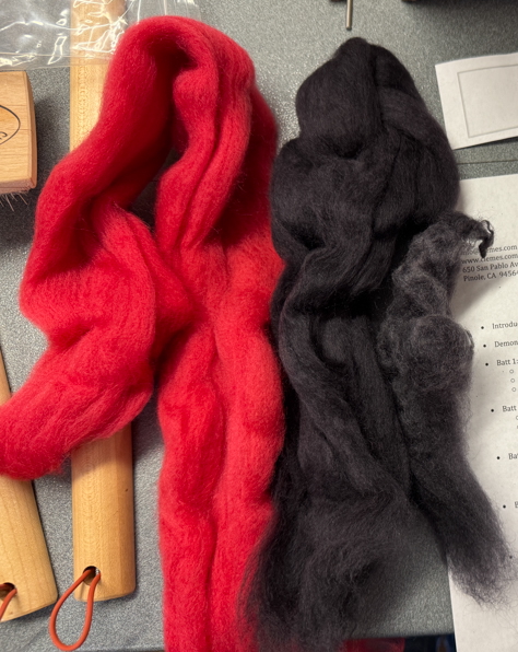 I didn’t get to doing the carding of these during the workshop itself. Instead, I brought the materials home and did the carding on my carder at home. The exercise was supposed to be one art batt, but it seemed to me to fall naturally into 2 separate batts, and that’s what I did.