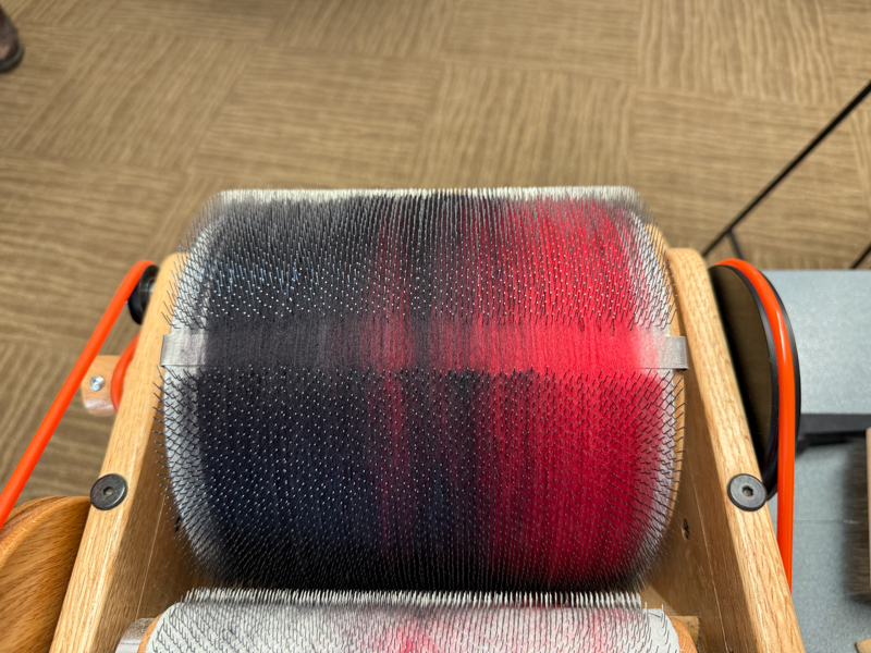We had two very distinct colours of BFL, which we put on the drumcarder in a gradient. And, then, pulled off in rolags! I spun them from the tip.