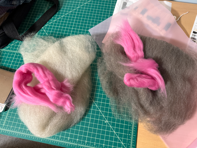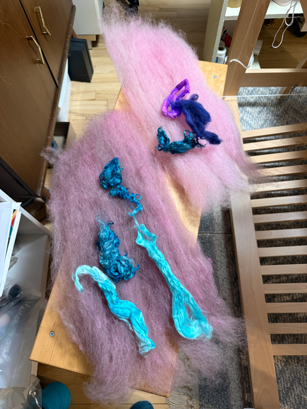 I made the 2 batts from the light and darker base fibres, blending in the pink roving to each of those proportionately, to make a semi-solid batt. And, to those batts, I added the colourful inclusions.
